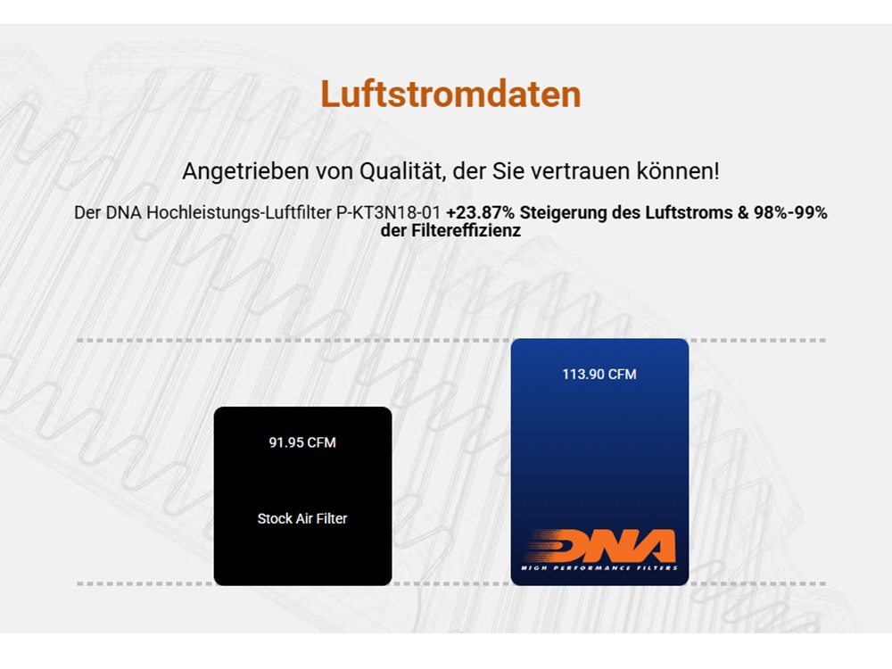 Der Filter sollte 1x jährlich oder alle 15.000 - 30.000 km gereinigt und geölt werden. Der Filter darf nicht ungeölt verwendet werden da das Filtermedium sonst nicht die optimale Filterwirkung erbringt. Für das Reinigen und Ölen dürfen ausschließlich die DNA Serviceprodukte verwendet werden!