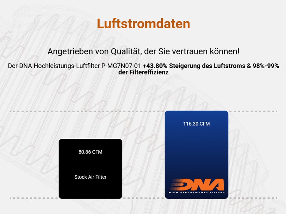 Der Filter sollte 1x jährlich oder alle 15.000 - 30.000 km gereinigt und geölt werden. Der Filter darf nicht ungeölt verwendet werden da das Filtermedium sonst nicht die optimale Filterwirkung erbringt. Für das Reinigen und Ölen dürfen ausschließlich die DNA Serviceprodukte verwendet werden!