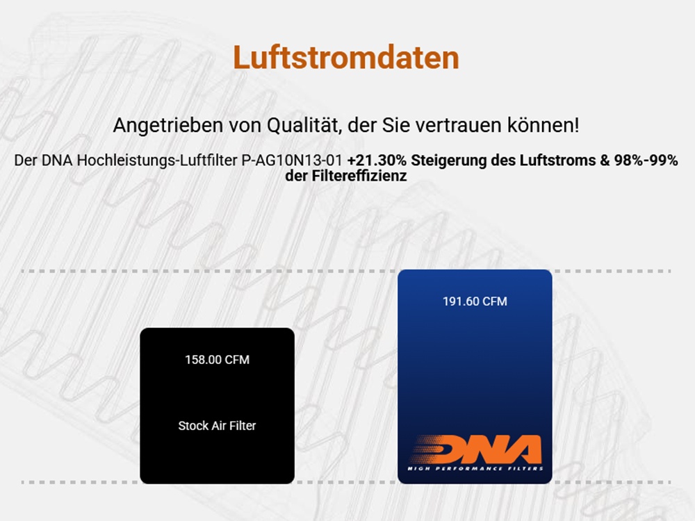 Der Filter sollte 1x jährlich oder alle 15.000 - 30.000 km gereinigt und geölt werden. Der Filter darf nicht ungeölt verwendet werden da das Filtermedium sonst nicht die optimale Filterwirkung erbringt. Für das Reinigen und Ölen dürfen ausschließlich die DNA Serviceprodukte verwendet werden!