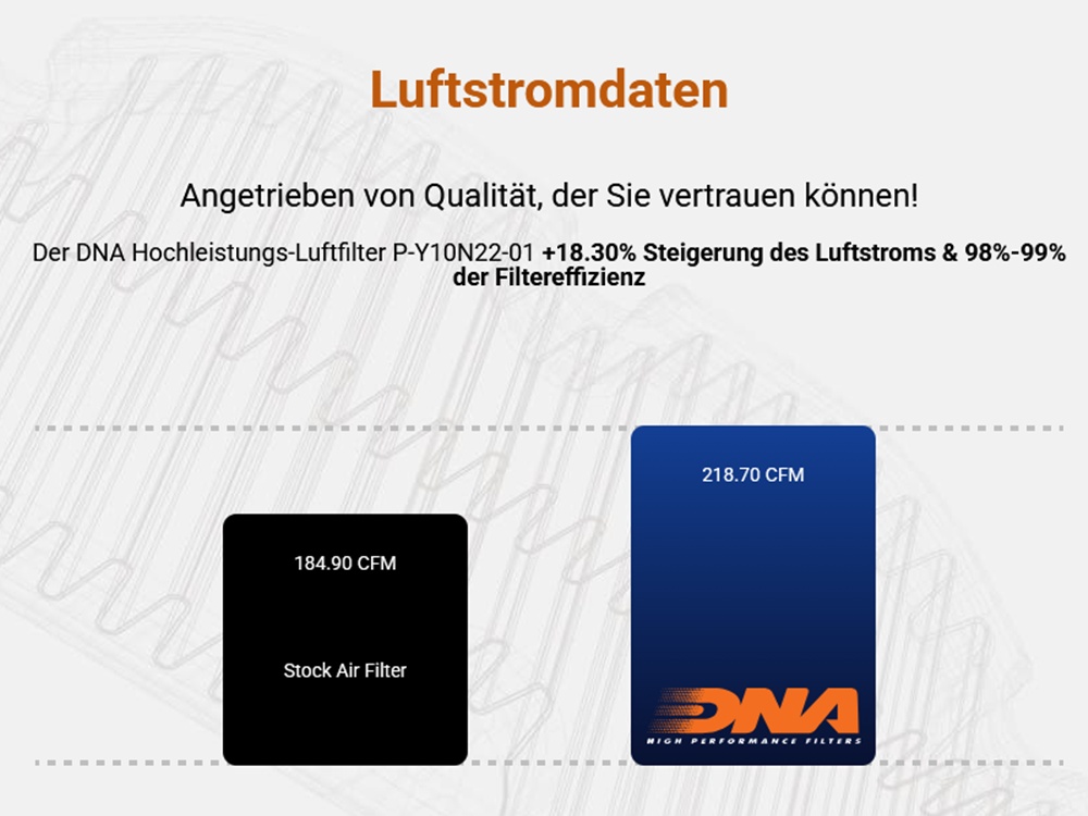 Der Filter sollte 1x jährlich oder alle 15.000 - 30.000 km gereinigt und geölt werden. Der Filter darf nicht ungeölt verwendet werden da das Filtermedium sonst nicht die optimale Filterwirkung erbringt. Für das Reinigen und Ölen dürfen ausschließlich die DNA Serviceprodukte verwendet werden!