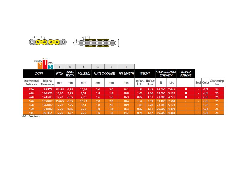 Entwickelt, um eine hohe Widerstandsfähigkeit gegen Dehnung und die starken Stoßbelastungen beim Offroad-Fahren zu gewährleisten. Verlängerte Buchsen und massive Rollen, Bolzen aus legiertem Kohlenstoffstahl und kugelgestrahlte Laschen für erhöhte Zugfestigkeit und Ermüdungsbeständigkeit sind einige der wichtigsten Merkmale. RX-Ketten verfügen über geformte Buchsen und spezielle „X-verchromte Bolzen aus legiertem Kohlenstoffstahl sowie spezielle Schräglaschen, die auch unter härtesten Offroad-Bedingungen einen zuverlässigen Eingriff gewährleisten.