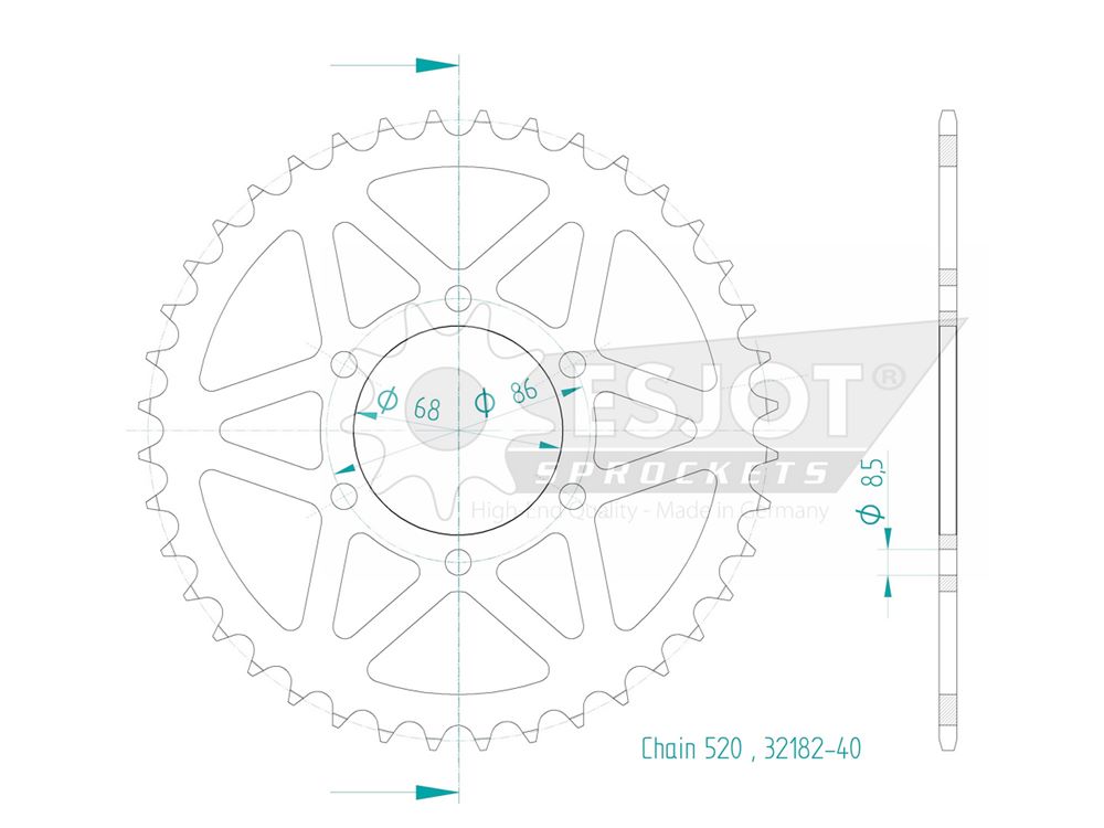 Das Kettenrad besteht aus hochwertig verarbeitetem Stahl (C49 / C45) und weist neben der präzisen Verarbeitung eine lange Lebensdauer auf. Dieses ausgehärtete Material bürgt, in Verbindung mit kompletter Fräsbearbeitung auf modernsten Maschinen, für höchste Qualität. Die Teilung ist 520.