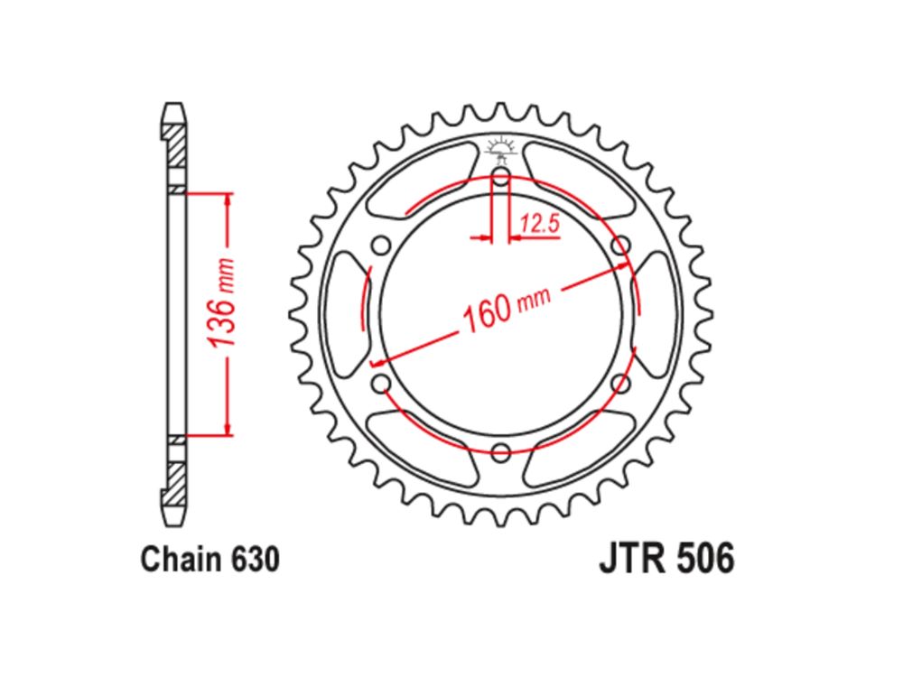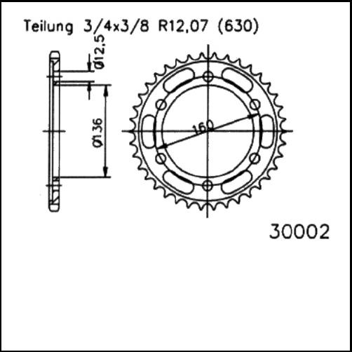 Das Kettenrad besitzt 40 Zähne mit der Teilung: 630 (für weitere technische Details zum Kettenrad bitte: Bild vergrössern anklicken)