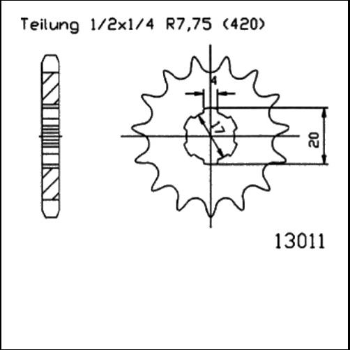 Das Kettenritzel mit der Teilung: 420 (für weiter technische Details zum Kettenritzel bitte: Bild vergrössern anklicken)