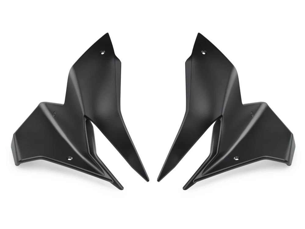 Ihr Design vergrößert optisch die Frontpartie des Motorrads durch große geneigte Flächen, die ihm nicht nur eine imposantere Präsenz verleihen, sondern auch Abtrieb (Downforce) auf die Vorderachse bei hoher Geschwindigkeit erzeugen. Dieser Effekt entsteht, weil die Luft, die über die Oberseite des Flügels strömt, Druck nach unten ausübt, während der untere Luftstrom beschleunigt und einen Unterdruck erzeugt. Das Ergebnis ist ein aerodynamischer Anpressdruck von bis zu 5,4 kg auf die Vorderachse mit zahlreichen Vorteilen für das Fahrverhalten:
